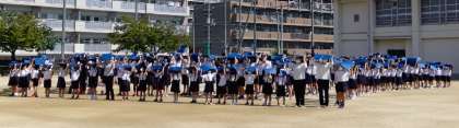 午前10時20分の校内放送を合図に、子どもたちが教室から運動場に集まり、クラスごとに割り当てられた場所に等間隔で並びます。