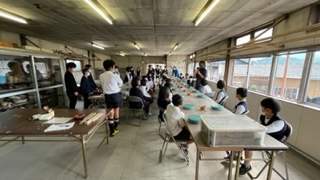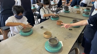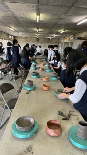 宗陶苑では、「手ひねり体験」をします。手回しロクロを使って、紐状にした粘土を積み上げていきます。お皿にするのか、湯呑茶碗にするのか、または・・・・・。一人一人の思いのまま自由に作っていきます。積み上げていくと、粘土の重さで形が変わってきたり、厚みを均一に積み上げていったりするのが難しいようです。