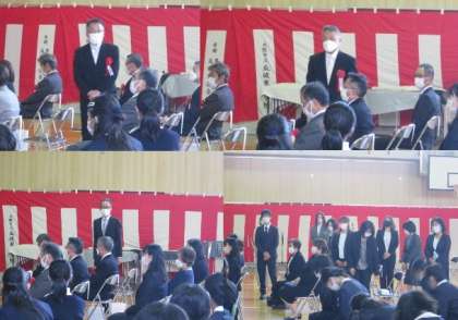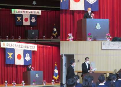 午前10時30分、日頃からお世話になっている瓜破東地域の皆様、歴代のPTA役員の方々、そして、歴代の校長先生をお招きし、児童代表の6年生が参加し、記念式典が始まりました。