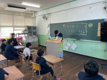 縦割り班ごとに教室に集まり、6年生が絵本の読み聞かせをしました。とっておきの絵本を選んで読んでくれた6年生のお兄さん、お姉さんの声に、みんな熱心に耳を傾けていました。