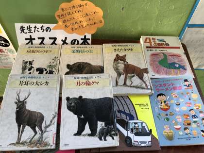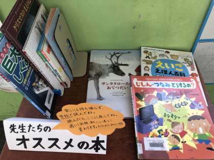 先週は、国語で学習している『大造じいさんとがん』の作者の椋鳩十さんの本を、今週は地震の本、英語の絵本、そしてクリスマスの絵本を置きました。
