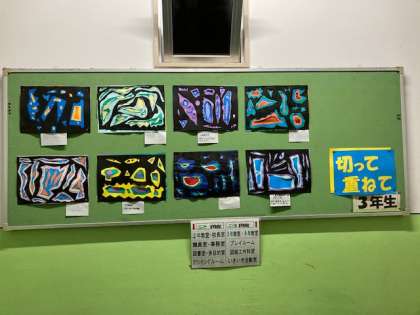 1組2組の教室と,職員室横の2号階段,図書室横の3号階段の掲示板にも作品があります。
