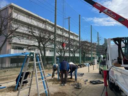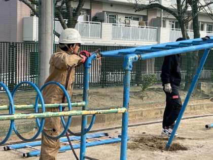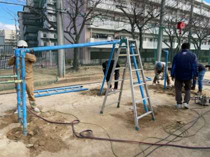 (左)うんていの土台を掘ります。同時に切断作業が始まりました。