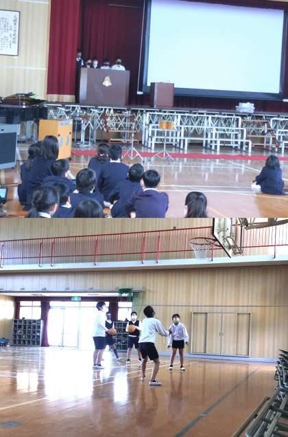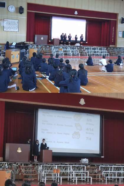 5年生は、5年生になってから各教科で学習したことをニュース番組仕立てで発表しました。司会の人が進行し、グループごとに発表します。こちらは司会・体育・音楽・英語の様子です。