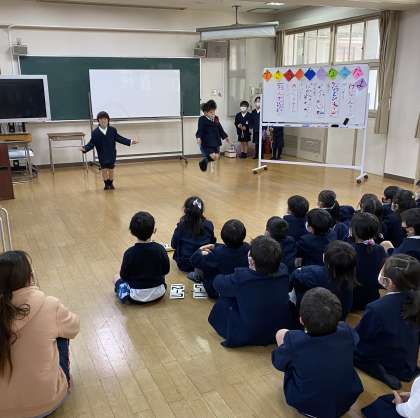 音楽で学習した合奏、体育で学習したなわとびや体操、国語・算数で学習した計算や暗唱など、それぞれグループに分かれて発表しました。