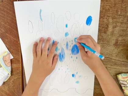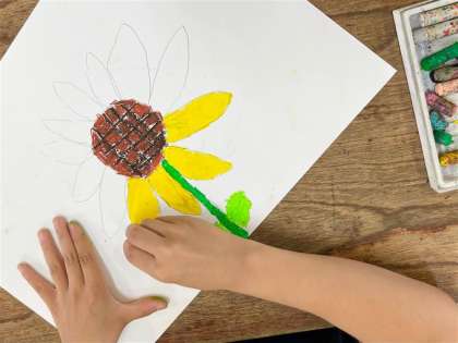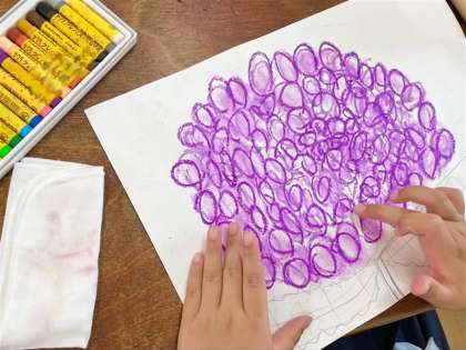 図工の時間に、中庭で梅雨を感じるものを探し、好きな画材で描きました。