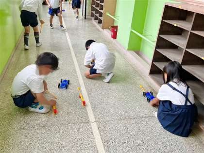 理科の時間に組み立てたクルマをゴムの力で走らせました。