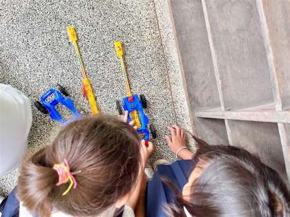 子どもたちはゴムを引っ張る距離の長さでクルマの動きはどのように変わるのかを体験しました。