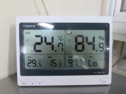 ところで、小学校の中で一番蒸し暑い場所は、給食室です。この日の給食室の最高気温が、29.5度、湿度が97.1%です。(画像:下部に今日の最高気温と最高湿度が表示されています。)湿度が100%に近い状況とは・・・・お風呂場の湿度を想像してください。