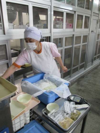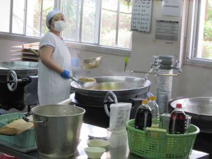 このような状況の中ですが、二人の給食調理員さんは、毎日笑顔で、抜群のチームワークで、おいしい給食づくりに取り組まれています。(画像)