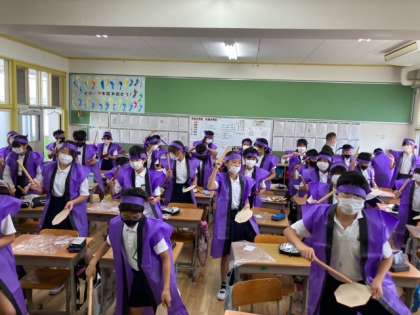 5年生は、『心を1つ』にはっぴを羽織って踊ります。