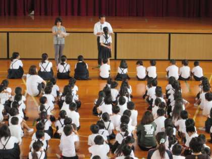 7月13日(月)、児童朝会では読書に関する表彰を行いました。子ども達は、この1学期間、様々な場で本に親しむことができました。そして読書の後、読書ノートに記録しています。今回、1年生〜4年生までの中で100冊の本を読んだ子ども達に『読書100冊賞』、5年生・6年生で50冊の本を読んだ子ども達に「読書50冊賞』の表彰状が、校長先生より手渡されました。(尚、1年生〜4年生までの『読書50冊賞』は、各教室で担任の先生より手渡されました。)