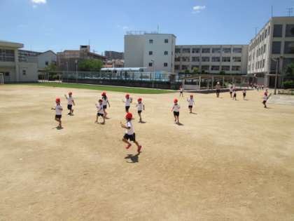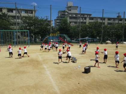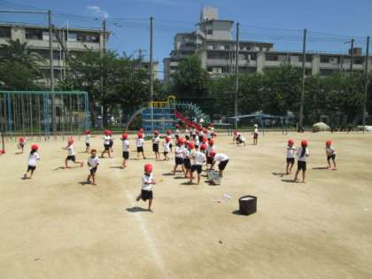 7月15日(水)の2時間目、体育服に着替えた1年生の子ども達が、ペットボトルを持って運動場に現われました。そして勢いよく中の水を押し出して、お互いにかけあっていました。プールでの学習以外で、友だちに水をかけ合うことは、なかなかできません。しかし、今日の日は、特別です。この日の生活科学習では、体全体を使って水とたわむれたり、水を利用して遊ぶおもちゃを使いながら、友だちとの遊びを楽しんだりすることをねらいとしています。この日、日本の南海上の台風11号が近づき、真夏の太陽が照りつけていました。他には誰もいない、ひっそりとした運動場で、1年生の子ども達の元気な声と笑顔が響きわたっていました。