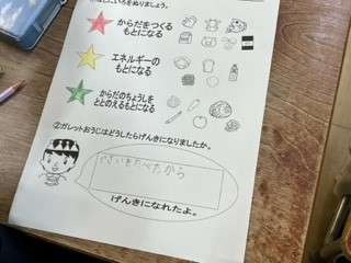 ゲストティーチャーとして平野南小学校の栄養士の先生に来ていただき、食べ物の栄養について教えていただきました。始めに紙芝居で楽しく学び、その後プリントを使って3つの色の栄養について詳しく学習しました。これからも好き嫌いをしない食生活を意識し、すくすくと健やかに成長してほしいですね。