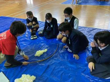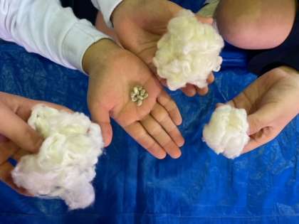10月に引き続き、クラフトパークの方に来ていただきました。綿がどのようにして糸になるのか、さらに糸から布にする機織り機の使い方などを体験しました。