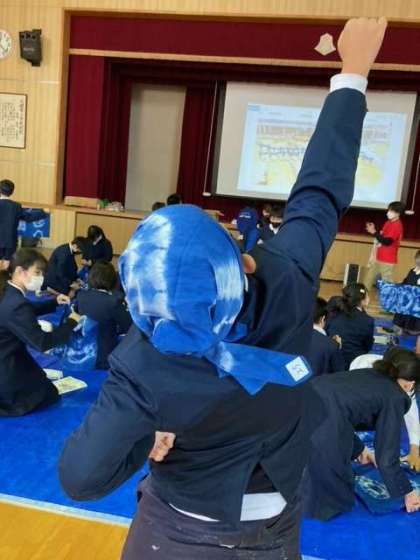 体験の最後に、前回におこなった藍染の布をお土産にいただきました。
