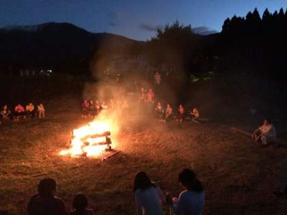 いよいよキャンプファイヤーです。午後7時からの始まりですが、この時間では、まだまだハチ高原は明るいです。しかし、東の方角の山ぎわからしだいに暗くなっていきます。そして、大阪市内では体験できないような暗闇へと変わっていきます。