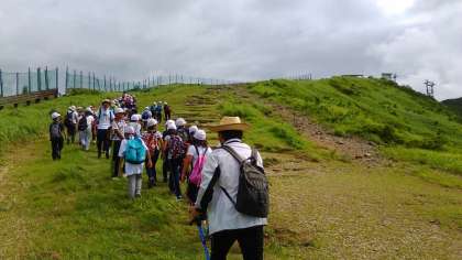 いよいよ山頂に向かって再出発です。元気な子ども達が、歌を歌いながら歩いていたのですが、少しバテてきたようでした。しんどくなっても、ふと目を下に向けると、美しい高原の景色が広がってきます。そして、目指す頂上も見えてきました。