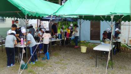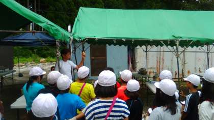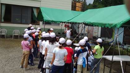 まず、宿舎の方から、カレー作りの基本を教わりました。おそらくどこのご家庭でもカレーを作られると思います。しかし、ここはハチ高原で、野外炊飯での調理です。野菜の切り方、調理の仕方も、家庭とは少しちがうところもあるかもしれません。子ども達は真剣な表情で、話を聞いていました。そして、役割分担に従ってカレーづくりがスタートしました。