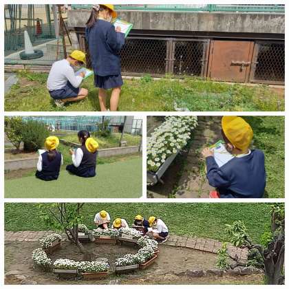 中庭で、子どもたちが思い思いに植物を選び、スケッチしています。