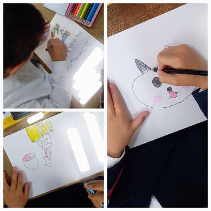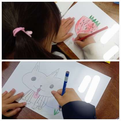 友だちに、自分の好きなものを紹介して、もっと仲良しになるようにカードをかいています。