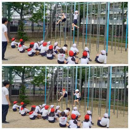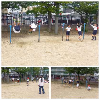 子どもたちは、互いに声をかけあって技の上達を目指しています。