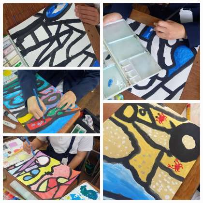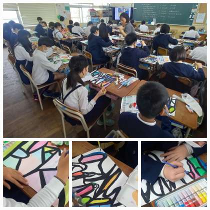 名前をデザインしてかいたところに、絵の具で彩色していきます。