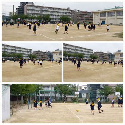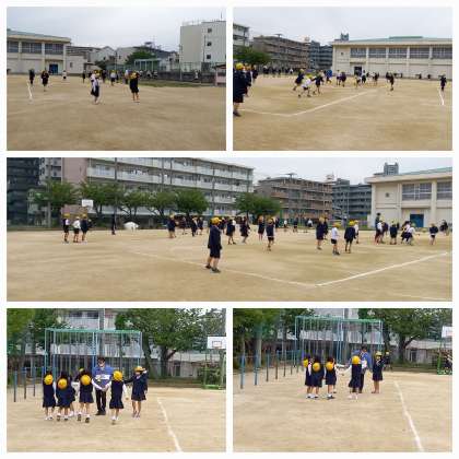 運動場で、低学年の子どもが生活指導支援員を誘って『花いちもんめ』をしていました。