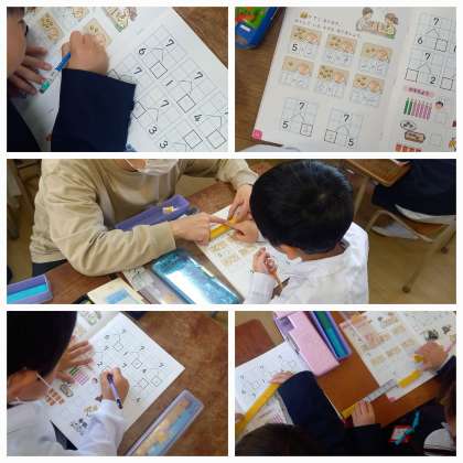 10までの数の合成分解の学習です。 7は、1と6。 7は、2と5。 7は、3と4。