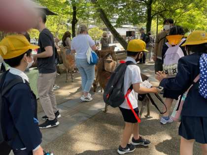 興福寺に向かう途中、鹿と初対面、驚く子もいます。