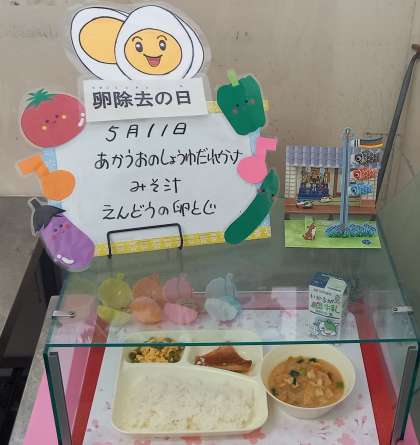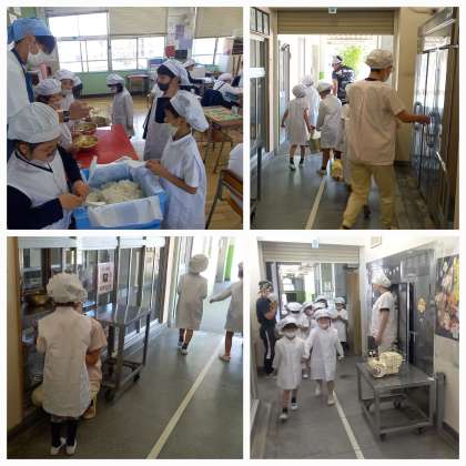 給食当番の子どもたちは、調理員から食器やおかずを受けとるときに「いっぱい食べるね」「今日は、好きなおかずやから嬉しい」など、食べることを楽しみにしている気持ちを伝えています。
