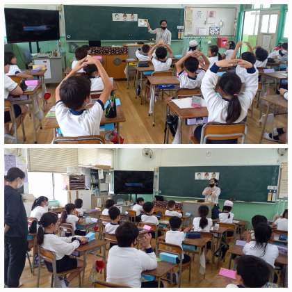 C-NETの発音する簡単な英語表現を、身振り手振りを交えながら繰り返し練習しています。