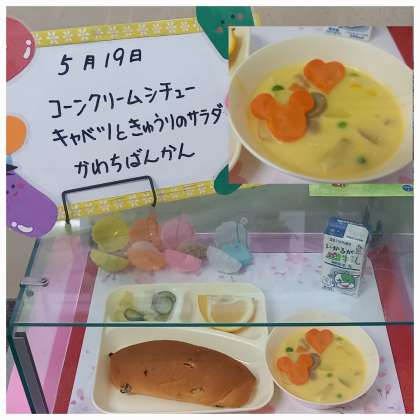 今日のコーンクリームシチューには、ラッキーにんじんがありました。かわいいにんじんに思わず笑顔になりました。