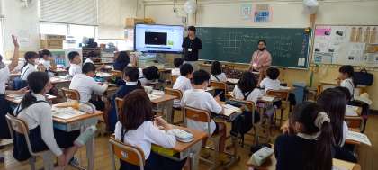 C-NETの話す英語をよく聞き、発音を繰り返し真似たり、ゲームなどを通して簡単な英語表現に親しんだりしながら楽しく英語の学習を進めています。