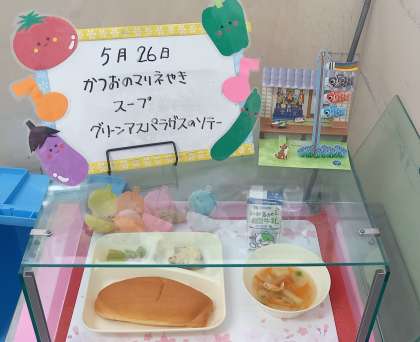 今日の献立にある「かつおのマリネ焼き」は、ノンエッグドレッシングを使用しています。