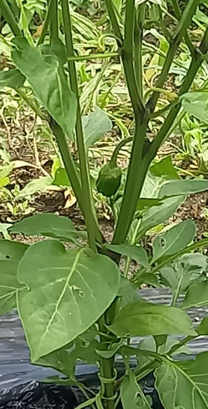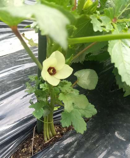 オクラの花が咲いたり、ピーマンが実ったりしています。