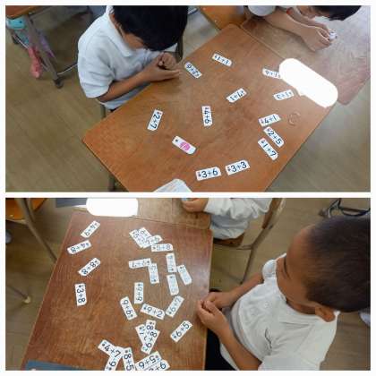 バラバラに置かれた計算カードの中から、『答えが9になるのは?』『答えが5になるのは?』と友だちと問題を出し合い、ゲーム感覚で計算練習をしています。