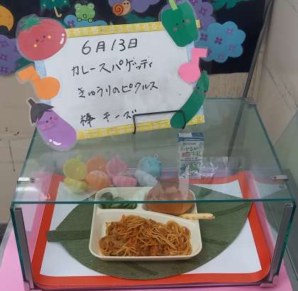 今日のスパゲッティは、子どもたちに人気のあるカレー味です。