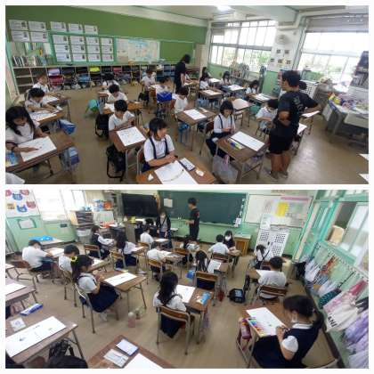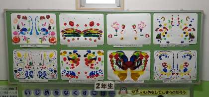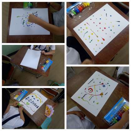画用紙に絵の具をポンポン置き、紙を半分に折って開くと・・・