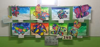 パスと絵の具を使って、カラフルなちょうを描きました。