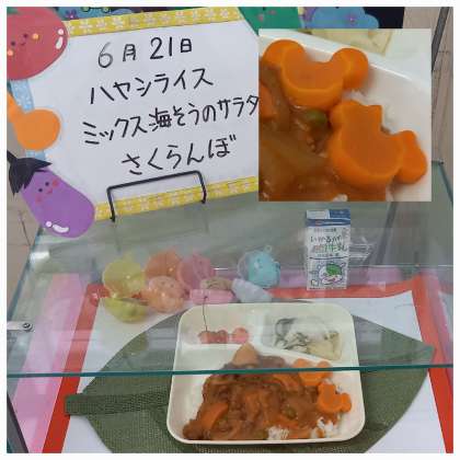 今日のハヤシライスには、かわいらしいミッキーの形をした「ラッキーにんじん」が入っていました。