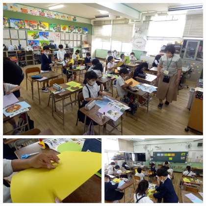 紙を重ねて、くるくる回る仕組みを考えます。