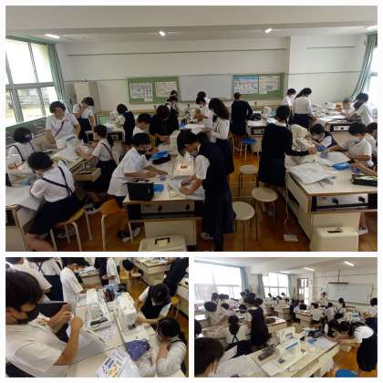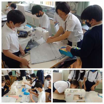 家庭科室では、6年生がミシンを使ってナップサック作りに挑戦しています。