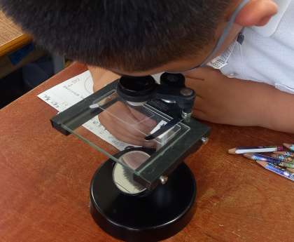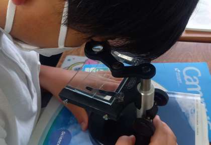 学習園にある池の水中には、どんな生物がいるのか顕微鏡で見ています。