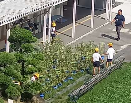 ミニトマトのお世話をしている2年生。 赤い実が、少しずつなっています。