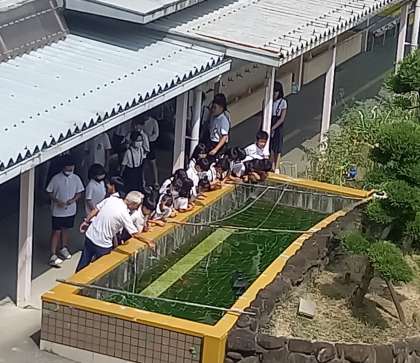 理科の学習では、校内の生き物や植物の観察を通年で行います。 カメや金魚の様子も観察します。