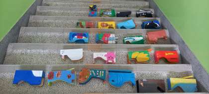 テープカッターの色づけ、ニス塗りが終わり乾燥させています。 あとは組み立てるだけです。