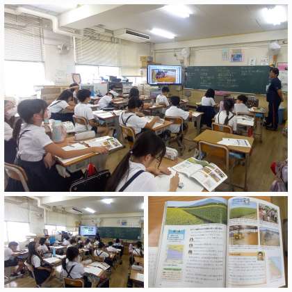 この「お米」を作っている米作り農家の抱える課題と、新しい取り組みについて教科書や映像資料等を活用し、みんなで話し合いながら考えています。