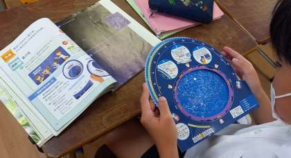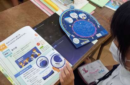 夏の夜空に輝く星を、星座早見を使って調べています。