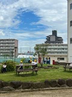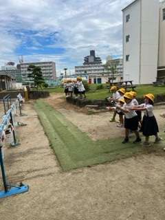 残ったお水で、地面にお絵描きしたり、お花に水やりしたりしました♪